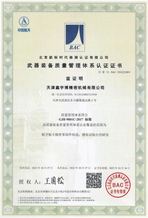 恭喜天津鑫宇博精密機械有限公司榮獲國軍標資質(zhì)證書!